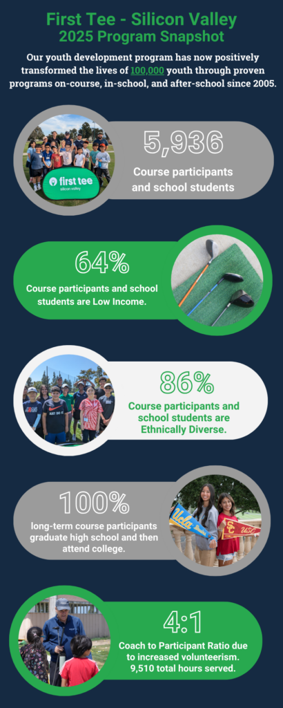 Our history dates back to 2000 when the San Jose Sports Authority (SJSA) – Santa Clara County’s sports commission – created the Eagles at Rancho del Pueblo (Eagles) junior golf program for East San José youth. In 2005, the Eagles became The First Tee of San José, a new chapter within The First Tee network of over 180 internationally, while remaining a program of SJSA. Having grown substantially by early 2012, the program expanded to all Santa Clara County and East Palo Alto and changed its name (and license) to The First Tee of Silicon Valley. The year 2014 began a new era as we separated from SJSA and became a new, 501c3, non-profit entity, The Future Talent of Silicon Valley DBA First Tee – Silicon Valley. Southern San Mateo County (north to Hwy 92) and Hollister were added to our service area in 2018. We have taught our life skills and golf skills curriculum to over 100,000 youth since 2005. Learn more about our impact and read Stories about our program.