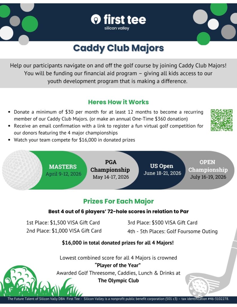 There are 2 ways to join our annual FTSV Caddy Club Majors, a fun virtual golf competition for our donors. 1) Make a Monthly Recurring (pledge) of $30+ per month for at least 12 months and immediately become part of our Caddy Club Majors. 2) Make a One-Time $360 annual donation. Every $360 donation you make allows us to cover just the registration fee and golf clubs for one low-income participant to attend 8 weeks of classes. If you are able to give more, consider sponsoring additional participants. You are helping us give more kids and teens access to our youth development program that is making a difference. Join FTSV Caddy Club Majors Anytime!